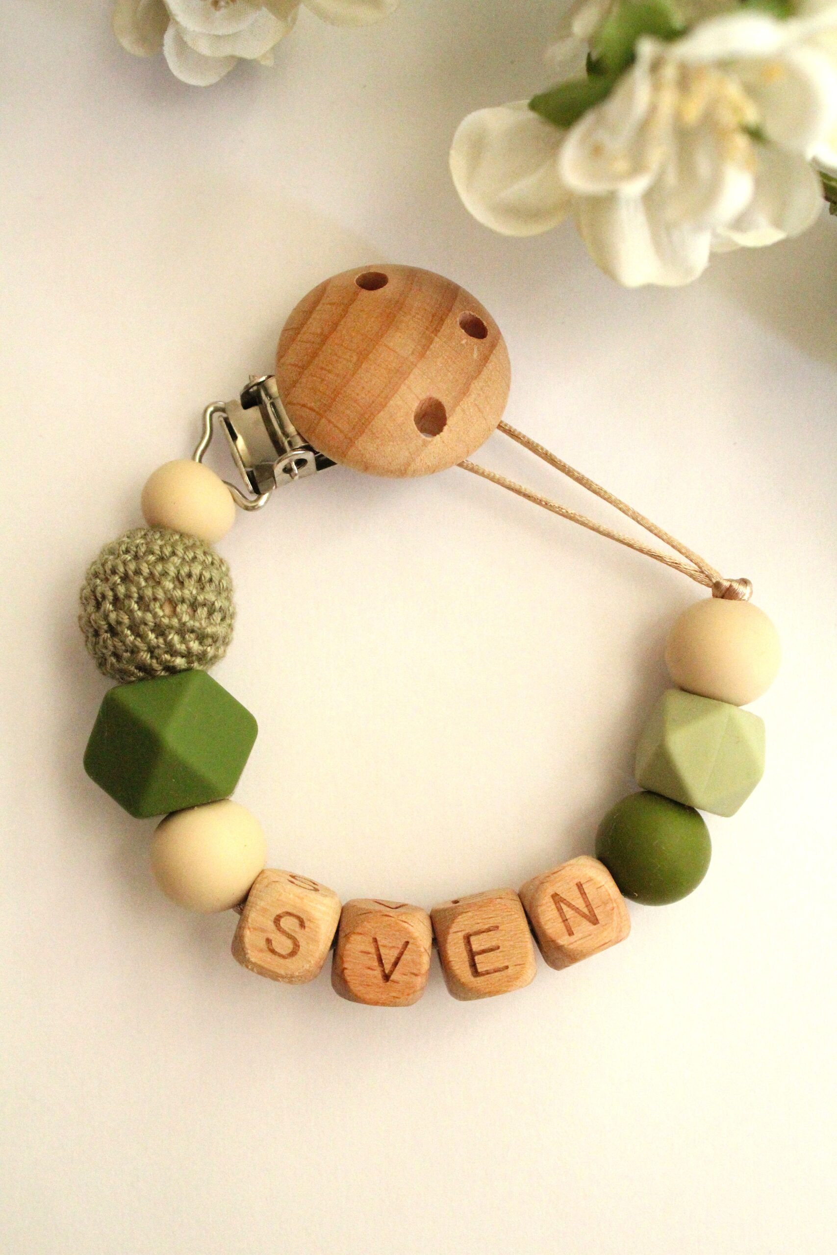 Met dit stijlvolle speenkoord met naam in groentinten blijft het speentje van je kindje altijd binnen handbereik. Het speenkoord combineert verschillende zachte groenkleuren met crème, wat zorgt voor een rustige en tijdloze uitstraling. Een praktisch item voor dagelijks gebruik én een mooi persoonlijk detail voor je baby.