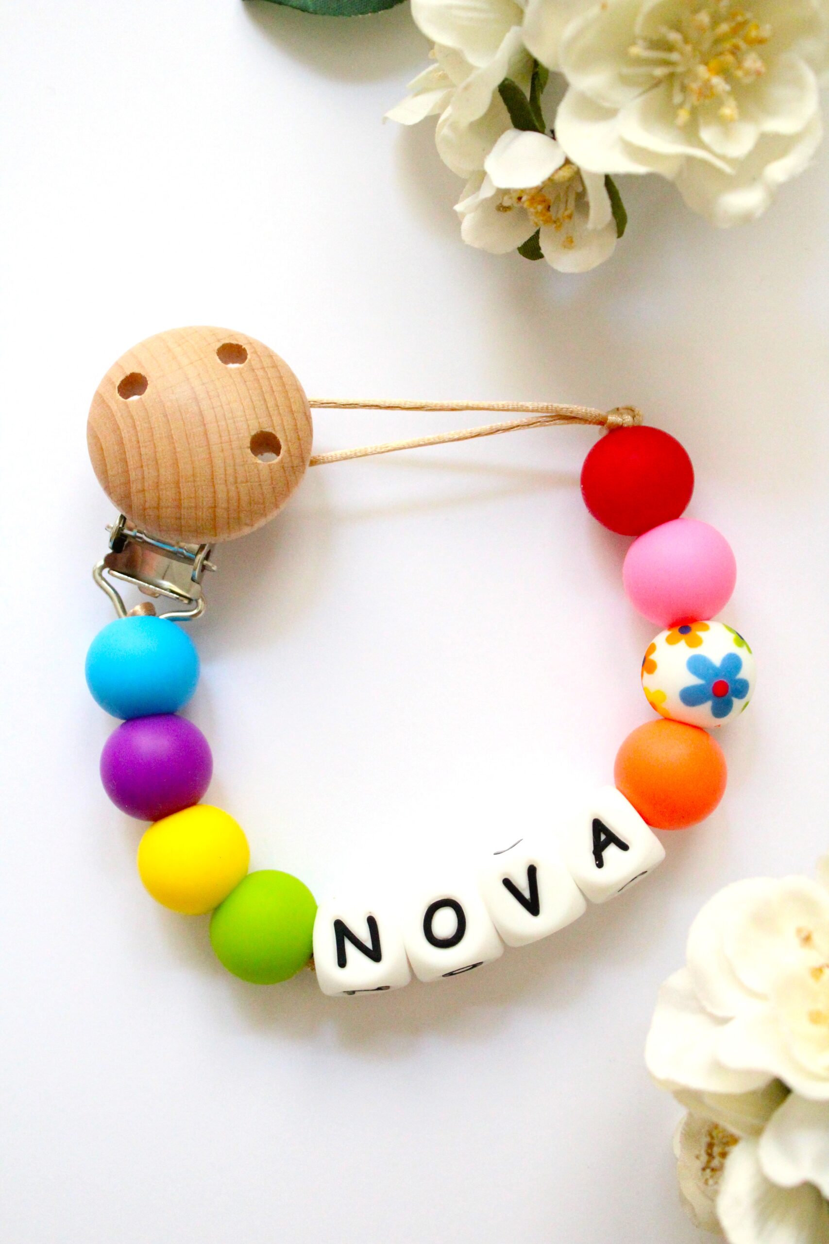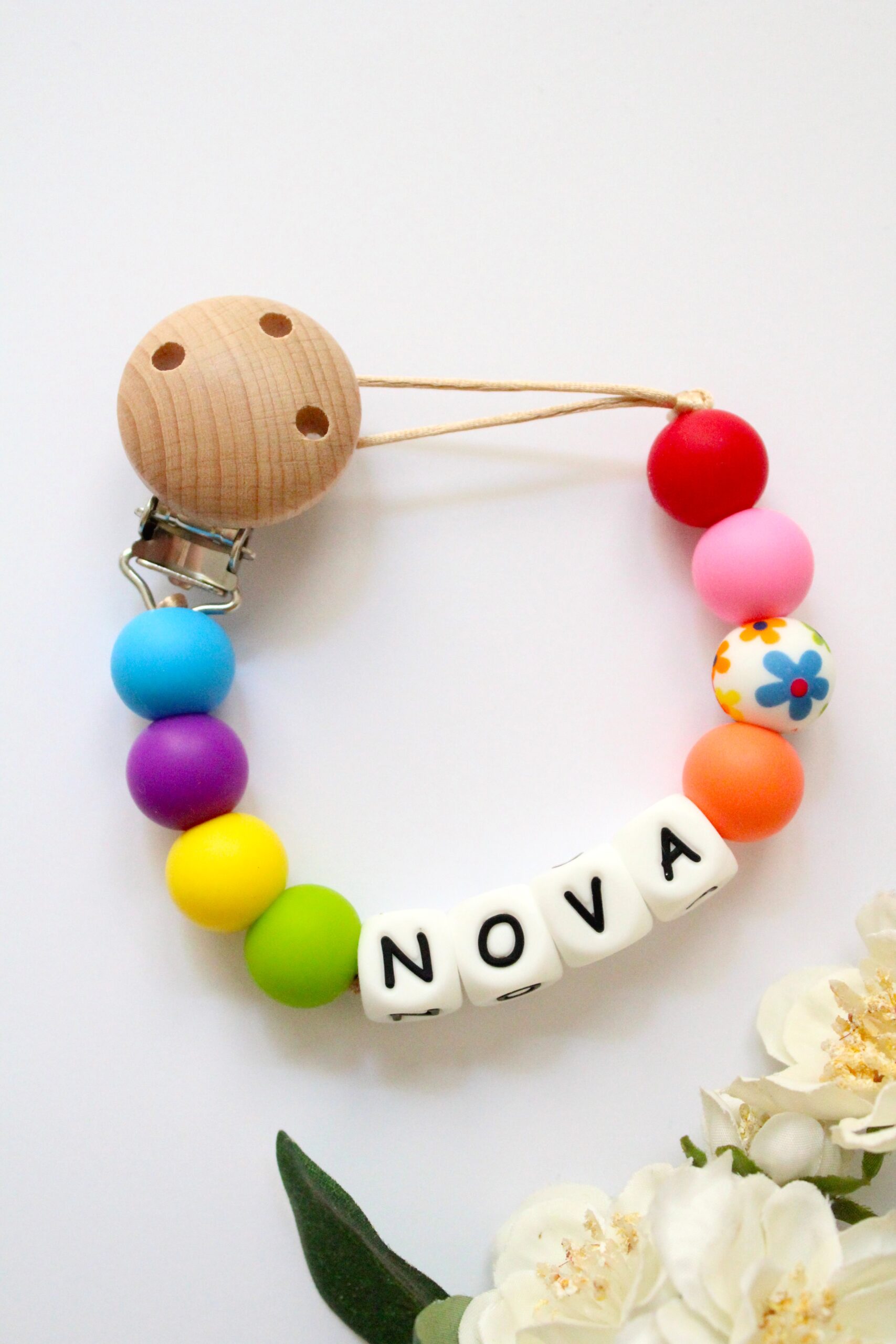 De speenkoorden worden stuk voor stuk met de hand gemaakt en samengesteld. Een praktisch รฉn persoonlijk item voor je babyuitzet of als cadeau.