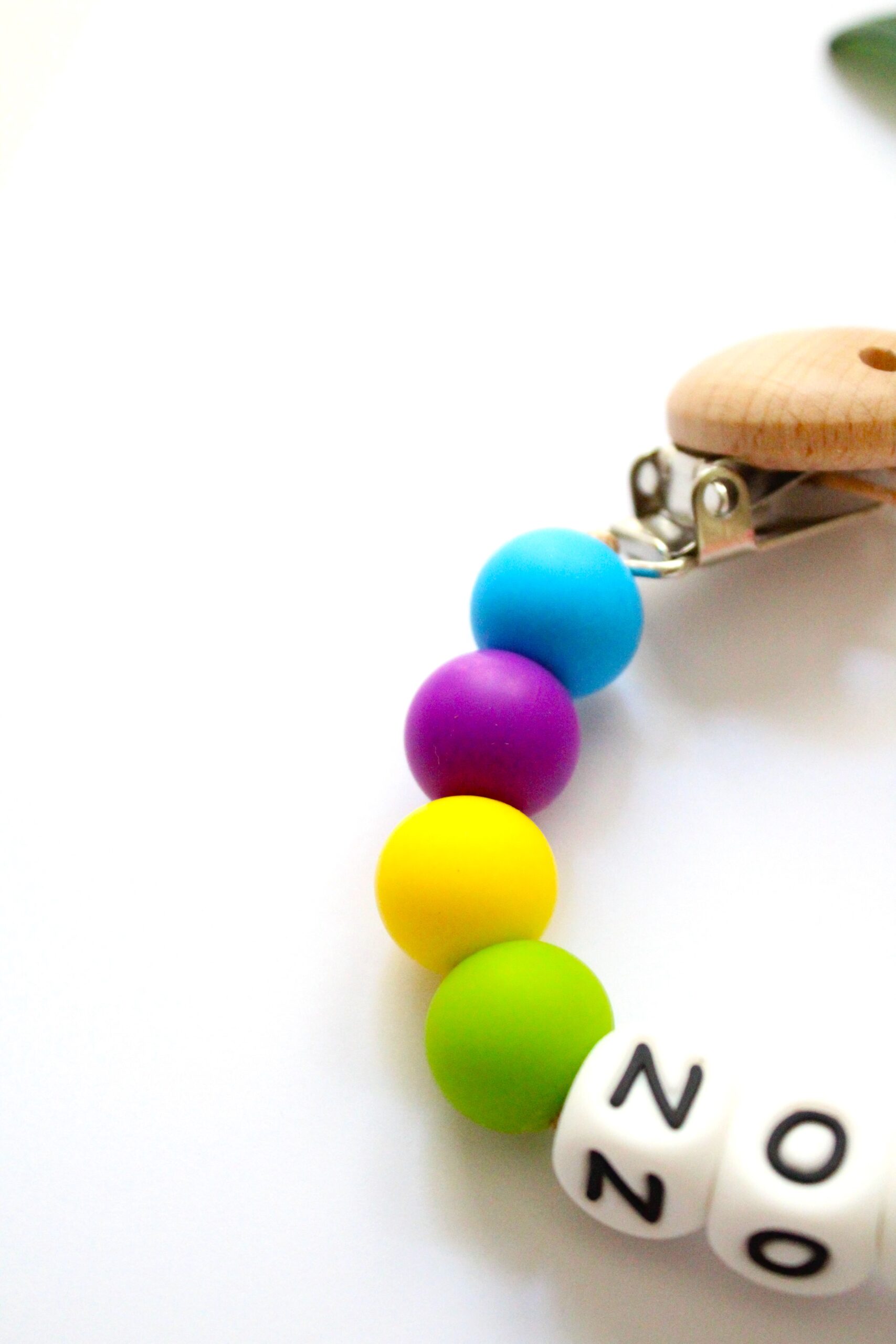 Voor de veiligheid volgens NEN 12586 mag het koord zonder clip niet langer zijn dan 22 cm. We passen het aantal kralen aan bij langere namen.